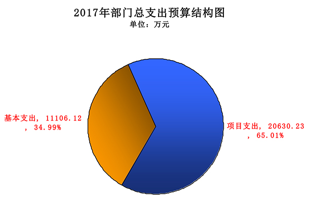 凤凰彩票平台登录入口2017年支出预算31736.35万元,其中:基本支出11106.12万元,占34.99%;项目支出20630.23万元,占65.01%。