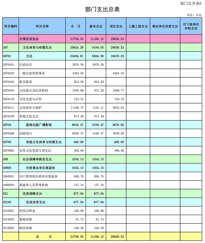 其中基本支出包含:行政运行2078.58万元、机关服务854.2万元、文化展示及纪念机构972.29万元、文化创作与保护1245.11万元、其他文化支出874.4万元、出版发行3169.47万元、归口管理的行政单位离退休896.79万元、离退休人员管理机构137.34万元、住房公积金448万元、提租补贴81.74万元、购房补贴348.2万元。