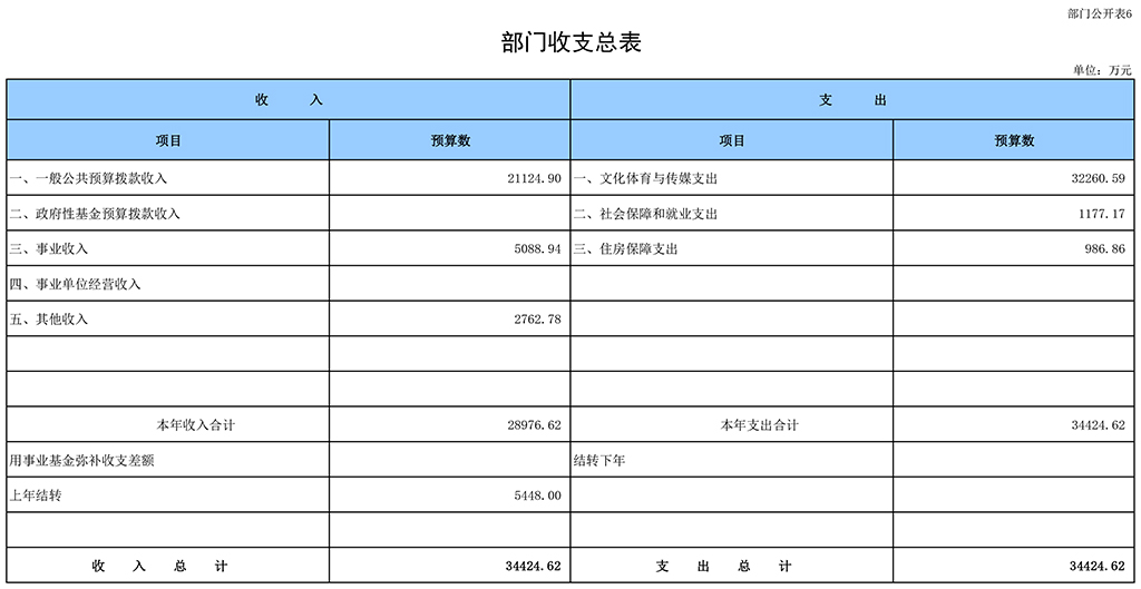 按照综合预算的原则,凤凰彩票平台登录入口所有收入和支出均纳入部门预算管理。收入包括:一般公共预算拨款收入,事业收入,事业单位经营收入,其他收入,上年结转。支出包括:文化体育与传媒支出,社会保障和就业支出,住房保障支出,结转下年。凤凰彩票平台登录入口2018年收支总预算34424.62万元。