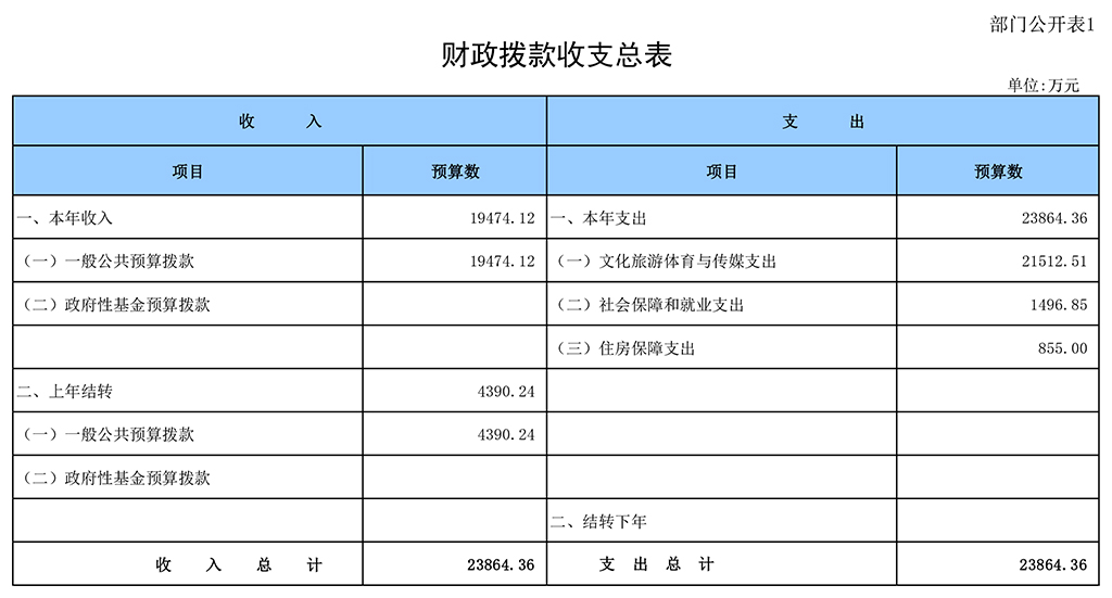 凤凰彩票平台登录入口2019年财政拨款收支总预算23864.36万元。收入全部为一般公共预算拨款,无政府性基金预算拨款,包括:一般公共预算当年拨款19474.12万元,上年结转4390.24万元。支出包括:文化旅游体育与传媒支出21512.51万元,社会保障和就业支出1496.85万元,住房保障支出855万元。