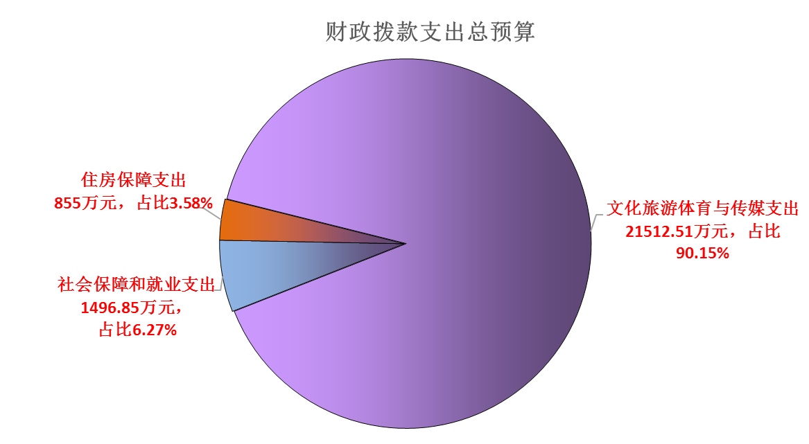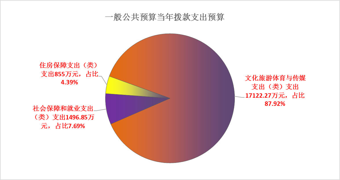 文化旅游体育与传媒支出(类)支出17122.27万元,占比87.92%;社会保障和就业支出(类)支出1496.85万元,占比7.69%;住房保障支出(类)支出855万元,占比4.39%。