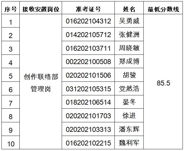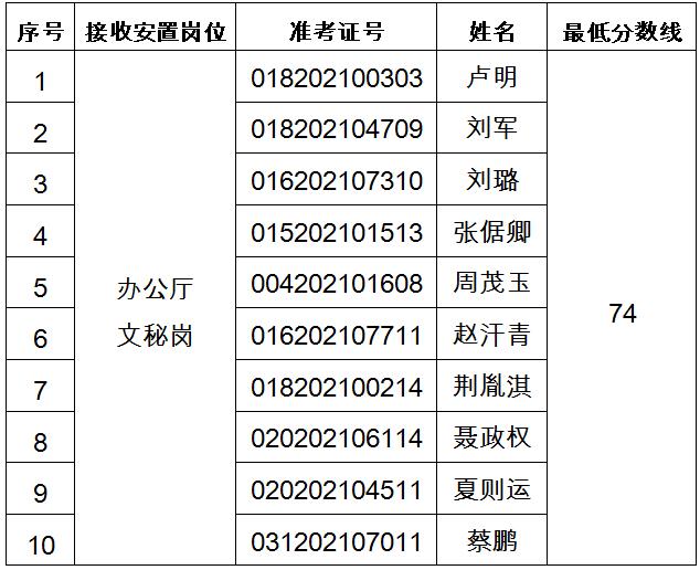 根据转业军官统考成绩,按接收岗位1:10的比例确定专业能力测试和面试人员。如有不能参加专业能力测试和面试的,按照统考成绩从高到低的顺序递补。递补人员名单不再另行公告,以电话通知为准。各岗位专业能力测试和面试人员(按姓氏笔画排序)、准考证号及最低分数线如下。
