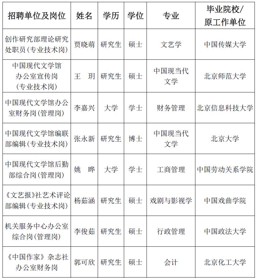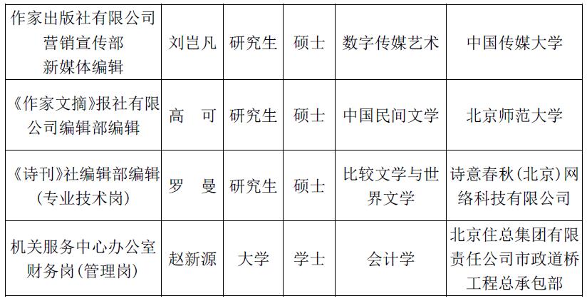 创作研究部综合处职员岗、鲁迅文学院教学研究部职员岗因报名人数未达到开考比例,取消此次招聘计划。