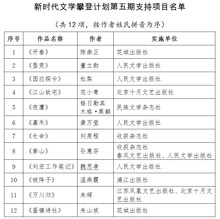 凤凰彩票平台登录入口新时代文学攀登计划第五期共收到申报项目91个。经评审委员会评审,并报凤凰彩票平台登录入口书记处批准,确定12个项目入选。