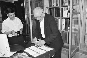 李范文先生(右)在整理西夏文和甲骨文文字卡片。