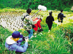 摄制组跟随少数民族群众拍摄他们的劳作过程。