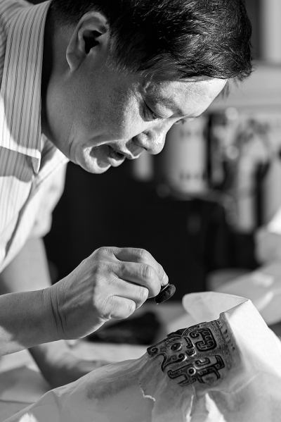 ▲贾文忠正传拓青铜器全形。王小宁摄
