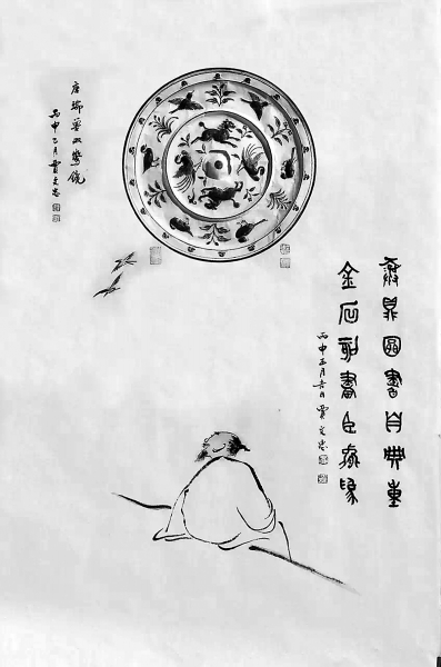 见一面瑞兽双鸳铜镜的墨拓如圆月悬于画中,月下坐一个宽袍大袖的文人,散淡闲适。想象他在赏玩这古镜拓片、画出胸中镜像时,正有举杯邀古人,对饮谈金石的快意和洒脱吧。