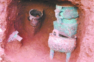 通过发掘,考古专家发现了目前石鼓山西周墓地中最大的一座墓葬。该墓葬呈长方形,深8米、宽约4米,为竖穴土圹墓,口小底大,约16.26平方米,棺室周围有熟土或生土二层台。属于单人葬,头向朝着地势较高的方向,有东向、南向及西北向。葬具均为木质,随葬品一般置于头部附近的二层台或壁龛内。