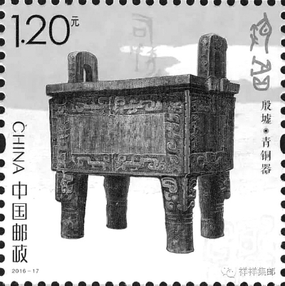 7月13日,中国邮政发行《殷墟》特种邮票,其中第二枚“青铜器”的图案是国家博物馆的镇馆之宝——司母戊鼎,现称“后母戊鼎”。这是迄今世界上发现的最大、最重的青铜器,也是河南安阳殷墟独特的符号。此前后母戊鼎已经两次绘入我国邮票。1964年8月25日,我国发行一套《殷代铜器》特种邮票,其中第八枚为“司母戊鼎”;2012年7月8日,我国发行一套《国家博物馆》特种邮票,其中第二枚“馆藏文物——鼎”,图案以“票中票”的形式再现了《殷代铜器》特种邮票中的“司母戊鼎”。