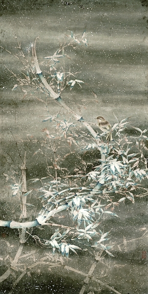 那是一个凄迷幽旷的竹林,晨昏晦暝的烟岚,雾蒸氤氲,清晖叆叇。霁雪使空气湿冷,深浅不一的远方忽明忽暗,几竿疏竹劲拔卓立,也有被积雪压折的竹干仿佛林间巨响,竹枝竹叶上覆盖着薄薄的积雪,静静地在微风中飘舞……