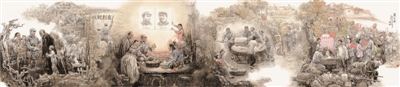 出于内心的虔诚,赵志田对绘画创作始终保有一颗谦逊之心。“艺术创作对一个画家来说,首先是一个学习的过程”,这种学习对他而言不仅是要全方位地了解笔下人和事的精神,更是让自己受教育、受感染,然后再浓缩、加工表现出这种精神。这对一位创作者来说尤为重要也难能可贵。了然于胸成为了赵志田下笔创作前必须要做的功课。自1972年开始,赵志田先后五次深入大庆油田体验真实的工人生活,甚至一呆就是几个月,感受极寒环境带来的挑战,与工人同吃同住,由此诞生了以《大庆工人无冬天》《石油工人一声吼,地球也要抖三抖》为代表的一批表现大庆工业建设的作品。到了20世纪80年代中叶,他决心要做一些力所能及的事,萌生了创作以太行山革命根据地为主题的抗日战争题材画卷,之后曾多次奔赴太行山访问革命老区,一路行走一路采访当年的亲历者或见闻者,尽力使画卷中的人物符合当时的年龄、身份、气质,诞生了《太行情》《烽火太行》等一批作品。即便在今天创作《遵义会议·伟大转折》时,赵志田依然坚持了这多年的习惯,和夫人奔赴遵义会议旧址,尽最大努力搜集图像、考证资料,甚至当年会议时的坐具也都经过了一番考证,因为对赵志田来说“用中国画表现群像本身就不容易,而要表现一个会议且都是真实的历史人物就更加困难”。历史题材需要严肃性,更需要画家对其有正确的认识。赵志田就是这样一个不怕“折腾”的画家。