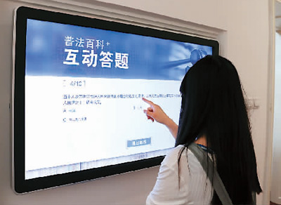 “当事人及其诉讼代理人因客观原因不能自行收集的证据,或者人民法院认为审理案件需要的证据,人民法院( )调查收集。”括号里选项有“可以”“应当”“应当委托律师”。在人机知识问答平台区域,笔者看到,林女士正认真地答着题,一番思考后,她在答题屏幕上按下了“应当”这个选项。随即屏幕上便弹出:“恭喜您答对8道题,获得普法达人称号。”“一共10题,对了8道,我还是很开心的。”林女士兴奋地说,“我觉得这个互动答题的板块特别好,这种知识问答的形式能让人们在游戏中学习法律知识。”