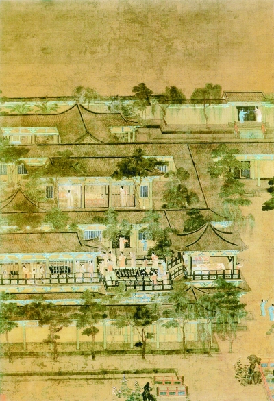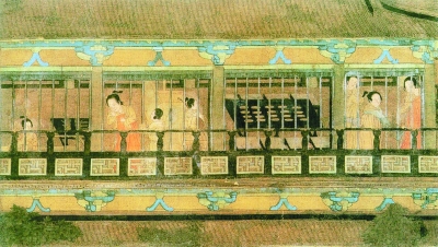 在这座楼阁叠起的王苑公馆内,建以巷道分割的多进大小院落,木结构建筑的前厅、后廊,树荫掩映,四周环以回廊。中轴线左右侧建有多座较小院落,明间装门,左右间装窗。正如画面所示,当时的门主要是版门,窗一般为直棂窗和破格子棂窗。廊庑环绕,一方面通过门和道路组织最佳观赏路线,另一方面又通过重重廊庑增加纵深感,形成建筑物内向的封闭式院落,既表现了豪贵生活的骄纵富有,又显示了深宫仕女的凄清冷寂。