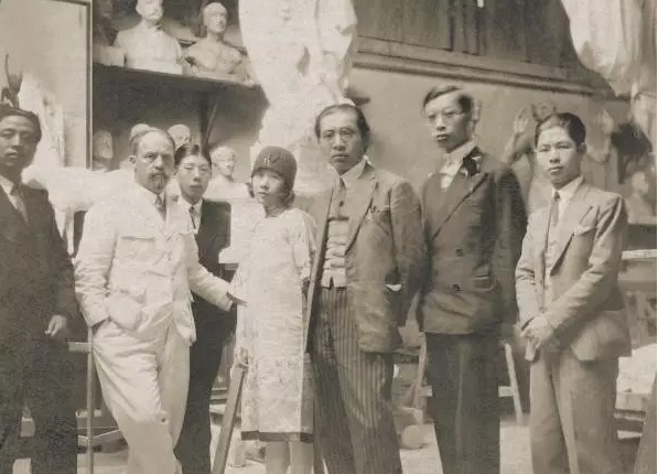 刘海粟一行到访巴黎美院教授、著名雕塑家朗特斯基工作室。照片人物:朗特斯基(左二)、刘抗、傅雷、刘海粟、张韵士(右一至右四)