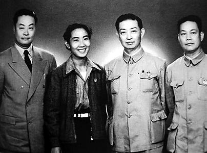 左图为1949年秋程砚秋、袁雪芬、梅兰芳、周信芳(从左至右)在一起留影