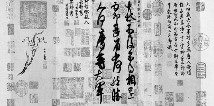 关于《中秋帖》的鉴藏和传世,还有颇多曲折的故事。此帖卷后有明董其昌、项元汴,清乾隆题跋,其中附乾隆皇帝、丁观鹏绘画各一段。卷前后及隔水钤有宋“宣和”内府、南宋内府,明项元汴、吴廷,清内府等鉴藏印。足可见此帖曾经宋代宣和、明项元汴、清内府收藏。民国时,溥仪将其携出宫外,流散民间。