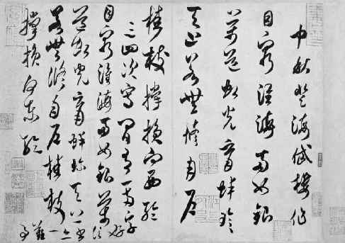 与中秋相关的法帖,还有一幅收藏于日本大阪市立美术馆的《中秋登海岱楼诗帖》,为宋代书法家、鉴藏家、收藏家米芾所作:“目穷淮海两如银,万道虹光育蚌珍,天上若无修月户,桂枝撑损向西轮。目穷淮海两如银,万道虹光育蚌珍,天上若无修月户,桂枝撑损向东轮。”