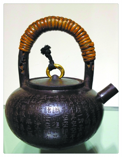 铁壶的形状最早就来源于中国,而壶身的纹饰则更直接地体现了中国文化。梅林随手拿起旁边的一把壶,滔滔不绝:“这把‘大国寿郎造汉诗壶’,距今约有150多年,采用失蜡法铸造,壶的一面是隶书《长干行》,另一面是行草《春晓》,壶上的很多纹饰其实是借鉴了中国的青铜器……”