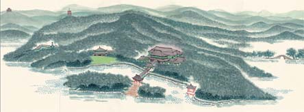接到以西湖为主题的创作任务,陈家泠便开始构思,他想起了自己2010年创作的《西湖十景》,当年他在杭州举办个展,要回馈故乡和母亲。这一次,还是画西湖,他不打算再画中国画里常见的西湖美景,想画的是G20峰会举行之地,用他的话说,是西湖的新景观、新面貌,他甚至有一个野心,就是希望画中的景色能成为西湖的“新胜地”。在陈家泠眼里,西湖是人间仙境,山水草木无一不蕴藏着生机与灵气,西湖也是文化胜地,文人墨客从来都流连忘返,不惜笔墨。在《西湖景色》里,他想画出西湖的自然美和文化美,实现现实性与前瞻性、现实与梦想、现实与艺术的融合。思谋许久,陈家泠选择以深浅不一的绿作为画面主色调,以山水画中的“米家点”为基本技法,晕染出一幅空灵、优雅、迷蒙而富有生命力的西湖山水图。传统的米家山水仅用水墨,陈家泠却在自己的创作中加入颜色,以期更符合现代审美,花青、藤黄,加上墨色勾线,整幅画用色简洁、大气,山重水复,绿意重重,呈现出蓬勃的生命力和高雅的意境,而这,也与陈家泠几十年来的追求一以贯之。