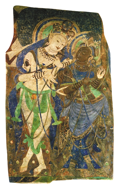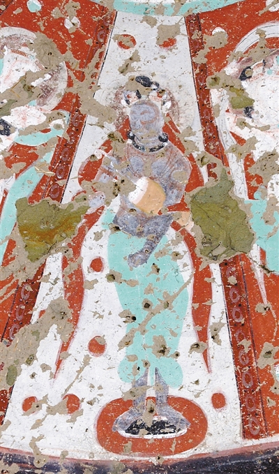 克孜尔石窟第八窟前壁壁画中弹奏五弦琵琶的伎乐天人