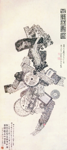 与唐英的手段不同,这是一种纯粹的艺术创作。清道光十二年,六舟精心制作了一幅拓片。四年以后,他用这幅拓片贺赠借庵和尚82岁寿诞。图中一个巨大的“寿”字用了三十多件或完整或破碎的古物拓片拼合而成,包括碑志、瓦当、钱币、砖文等等,除了少数体量较小的钱币可见其全形,大部分残砖断瓦上的文字零落不成章句。这些可辨而不可读的文字,使得历史既亲切又遥远。近处看时,这些彼此互不相关的文字碎片,好像随意散乱地叠压在一起,颠倒陆离,漫无用心;远观方知它们经过了作者苦心的经营,碎片的墨色浓淡不一,构成了“寿”字张弛有度的结构和用笔。