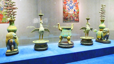 图为首都博物馆“走进养心殿”展中展出的嵌珐琅饕餮纹五供。 邱爽摄/光明图片