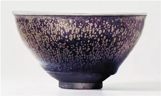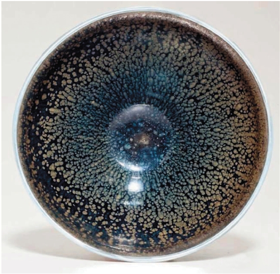 宋代斗茶艺术传到日本,经过吸收发展的抹茶道,能够很好地流传下来。优美而稀少的建盏长期以来是日本上层阶级珍藏的宝物,尤其在15世纪达到高潮。《君台观左右帐记》记载,曜变是建盏之无上神品,世上罕见之物,值万匹绢。油滴是第二重宝,五千匹绢,兔毫盏,三千匹绢。当今,优秀的建盏大都被日本收藏。仅存于世的3件曜变都被日本藏为国宝。油滴传世品也仅10余件,其中一件为日本国宝。我国没有一件完整的油滴。藏于日本静嘉堂文库的曜变被国际陶艺界公认为天下第一名碗并誉为陶瓷艺术的珠峰,但至今无人能复制,这也就可以理解当年为什么会有1500套别墅总和的高价了。