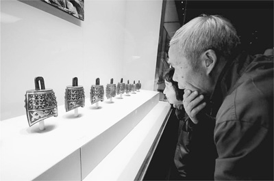 11日,观众在江西省博物馆欣赏西汉成套编钟。
