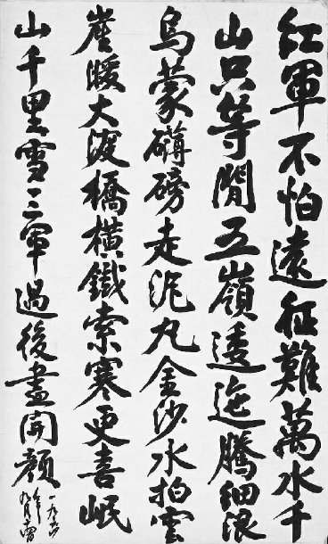 “红军不怕远征难,万水千山只等闲。五岭逶迤腾细浪,乌蒙磅礴走泥丸。金沙水拍云崖暖,大渡桥横铁索寒。更喜岷山千里雪,三军过后尽开颜。”