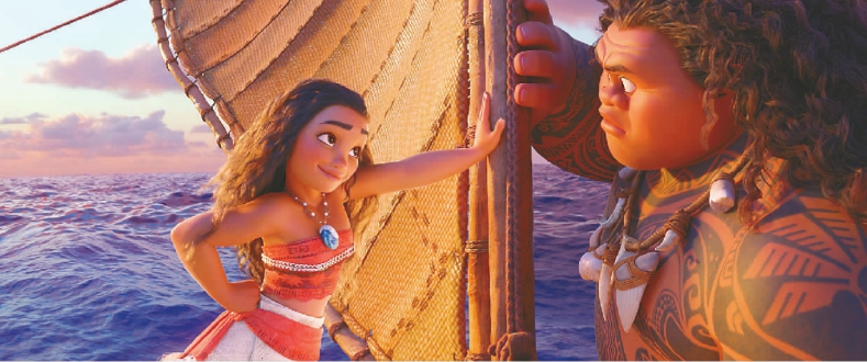 ●佟乐:完全没有参考《疯狂原始人》 。可能有的观众觉得他们都是穿草裙,动作都很灵活吧。这部片子在中国好像不是很轰动,但在美国票房很好。我觉得中美之间还是存在很大的文化差异,美国观众就不会有这样的感觉,他们有机会去夏威夷旅行,知道波利尼西亚的人大概是什么样子。实际上, 《海洋奇缘》逼真地还原了波利尼西亚人的环境和生活。波利尼西亚人的体态比较胖,身上有文身,因为天气很热,男生常常都是半裸上半身的。中国观众可能还会觉得,两部电影的有些角色都没有穿上衣,皮肤又都黑黑的。