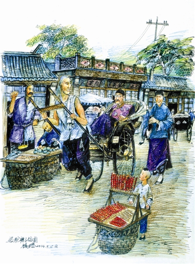 画老舍先生的作品就是要体会他字里行间的韵味,系统地再现当时的生活场景。让人们深刻记住老舍先生描述的祖辈们的生活,是我这次画展的初衷。画老舍先生的作品是要非常用心的,用怎样的技法,才能淋漓尽致地表现京味文化的韵味,是我从开始创作就苦苦追求的。艺术崇尚的是自然、现实,只有表现出深刻的内涵,不落窠臼又清晰准确,才能让大家喜欢和接受,我想这就是“老舍先生6部作品插图”绘画技法的真谛。