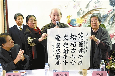 昨日现场播放了一段用10天时间拍摄剪辑而成的回忆短片。在与老舍先生相交最为密切的人艺艺术家口中,老舍先生的创作心境逐渐清晰。年逾九旬的漫画家李滨声不仅亲自到场,更为此次展览赋诗一首:芝兰君子性,松柏古人心。文光射牛斗,爱国志庆春。