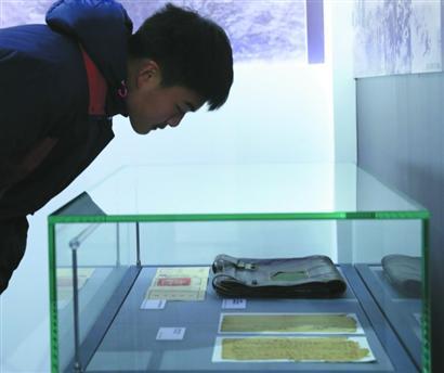 一名学生仔细观看淞沪抗战实物。张海峰 摄
