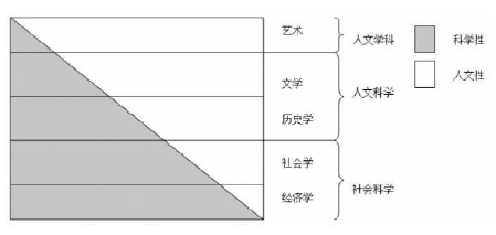 其中经济学是一极,其理性成分最重,而人文性最弱;另一极——艺术,其人文性最强,而科学与理性成分最弱,从经济学、社会学、历史学、文学到艺术,理性或科学性递减,人文性递增。当然,严格地说,最富艺术性的音乐,也含有理性,玛丽娅娜·韦伯为马克斯·韦伯《经济与社会》所写的前言中曾指出,“理性也在并且恰恰在音乐——这个似乎是最纯粹渊源于感情的艺术——里,起着一种至关重要的作用” 。艺术以下诸学科,皆以“学”命名,其中经济学、社会学可以称为社会科学,历史学、文学可以称为人文科学,而艺术,就不以“科学”称之,而是人文“学科” 。比如音乐,尽管也有乐章、旋律、节奏、节拍等理性规范,但它却是“最纯粹渊源于感情的艺术” ,不能以科学名之。