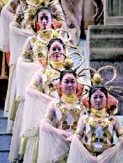 陈薪伊:我想可以说是对人性的探索与追求。普契尼对人性的诠释是伟大的,歌剧展示了图兰朵公主的暴戾行为,但也深刻地揭示了她暴戾行为的原因,她的残酷因着对祖母的爱,这是历史留给她的情感态度。但是这里也有漏洞,如果导演能够理解剧本的主题,就不应该选择一位凶狠的胖女人来饰演图兰朵。所以我选择了一位符合公主形象的女高音———孙秀苇。孙秀苇是活跃在国外歌剧舞台上的唯一华裔女高音。我当时爬过了音乐厅的很高的台子,看见她在台上走来走去,她那天穿了一件旗袍,我首先就看她的形象,身材很好,可以演公主,于是就定了她。此前她演过图兰朵,通过第一天的排练,我让她“再生”了一个图兰朵,这是这部歌剧表演思路上的创新。