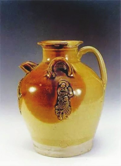青龙镇遗址考古展上展出的唐长沙窖贴花褐彩壶。
