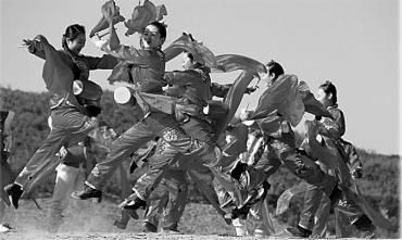 陕北高原是连接中原农业民族和草原游牧民族的重要通道,自古以来就是边关要地:秦始皇时期大将军蒙恬,率30万大军镇守陕北,筑长城,修直道,防止匈奴内侵;北宋时期韩琦、范仲淹、沈括等一代武将、文臣来到陕北,领导过抵御西夏人入侵的战争;而明朝时期九镇之一的“延绥镇”长城,几乎承担了明朝中、后期北方边境一半以上的防务。可以这样说,“安塞腰鼓”既是古代激励边关将士冲锋杀敌、浴血奋战的号角,也是将士们征战凯旋的欢迎曲。古代战争擂鼓鸣金的场面,永远地消失了。这种于激情和力量中的仪式,却深深地根植于陕北这块古老的土地上。陕北的乡间,腰鼓成为一种娱乐形式,于浪漫中宣泄生命的激情,于诗意中追求永恒的精神力量。