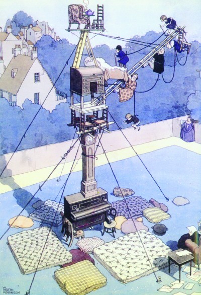 用上述异想天开的画风,希斯给很多工厂“改进”过工艺。它们确实够新奇大胆,却只有傻瓜厂长才会采纳。《牛津英语词典》干脆管画中这些繁琐而无用的装置叫“希斯·罗宾逊的装置”,意为“奇妙、荒谬、过于复杂”。英国人,真会玩儿!
