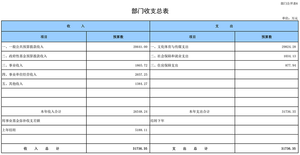 收入包括:一般公共预算拨款收入,事业收入,事业单位经营收入,其他收入,上年结转。支出包括:文化体育与传媒支出,社会保障和就业支出,住房保障支出,结转下年。
