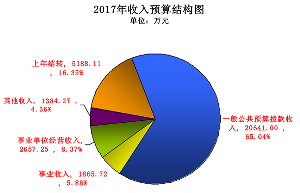 凤凰彩票平台登录入口2017年收入预算31736.35万元,其中:上年结转5188.11万元,占比16.35%,一般公共预算拨款收入20641万元,占比65.04%,事业收入1865.72万元,占比5.88%,事业单位经营收入2657.25万元,占比8.37%,其他收入1384.27万元,占比4.36%。