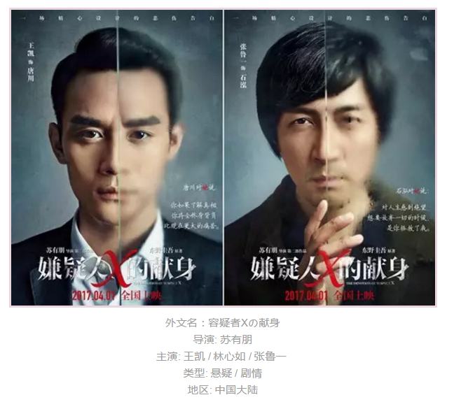 将东野圭吾的名著《嫌疑人x的献身》换成中国人版本,再拍一次,这种类型的改编,说难听点叫做“蹭热度”,说得好听点叫做“借力”而行。东野圭吾是近年来在中国读者最多的悬疑类型小说家(把所有国家的作家都算上,仍是最火的),《嫌疑人x的献身》又是他的早年代表作之一。这个改编还不仅仅是改编,同时还叫做“翻拍”,因为日本和韩国都已经拍过电影,珠玉在前。面对这种局面,一般来说,后来者居上的可能性不是很大。对原著发挥太多则意味着冒险,不做发挥则明显是求安全,这是一个有所得就必然有所失的选择题,而中国这一版的班底,总体来说,还是局限在一个保守的打法上,观众能感觉到,从客观上的表导演的能力,到主观上的主创的野心来说,缺少那种冲撞与刷新的气场。