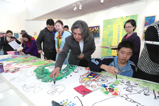 中国美术馆馆长吴为山表示,在家长和社会的呵护之下,这些孩子用手中的画笔尽情地描绘着心中的憧憬梦想,绘画也带给他们更加快乐而鲜活的生命体验。“他们的技巧也许不够成熟,他们的才艺也许不够惊艳,但他们通过作品所表现的,却是最为宝贵的人类天真。他们的作品,也引发凤凰彩票去探究艺术与艺术教育对个人的成长有何作用:艺术显然不是万能的,但它可以激发创造,开放思维,拓展想象,丰富情感,放松身心。”吴为山与参加活动的5位自闭症孩子现场共同创作《春天》。孩子们用丙烯颜料在一张宽90厘米、长4米的画布上纵情挥洒,描绘他们对美丽春天的感受和向往。