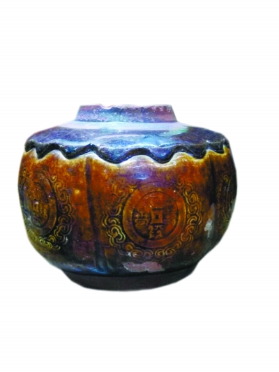明代紫砂酱釉筋纹绘钱披肩罐