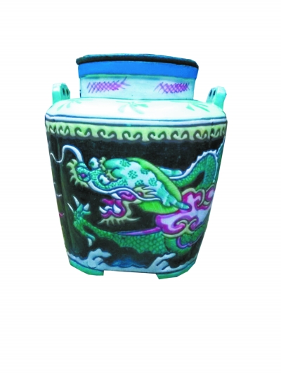 清朝时的紫砂挂釉器物更倾向于华丽。朱银木收藏的清中期四方倭角龙纹壶,艳丽多彩,尽显雍容华贵。壶身上的青龙栩栩如生,呼之欲出,而四爪的脚则说明这件器物在当时只有王公显贵才可使用。这类紫砂彩釉壶不惜工时、精工细作。为了使紫砂器绘上釉彩,需进行二次烧制,甚至三次,即使到了现在也需要10天左右才能完成烧制。“这把壶虽然残缺了,但我还是很喜欢,它是紫砂挂釉器物中难得的精品。”朱银木将这把龙纹提梁壶视若珍宝。