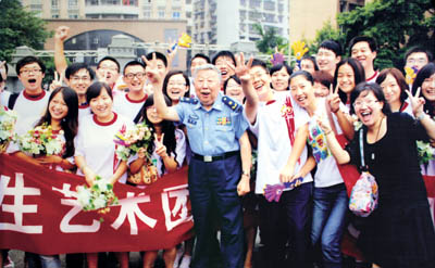 2010年,阎肃在重庆大学和大学生艺术团的同学们在一起