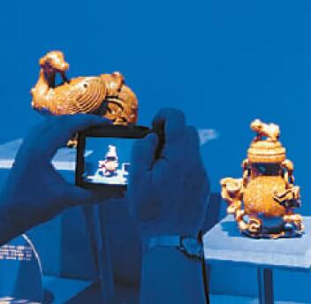 5月8日,“紫禁城与‘海上丝绸之路’”展开幕式上,观众正在拍摄金星玻璃烧造的系列工艺品。本报记者 王国平摄 光明图片