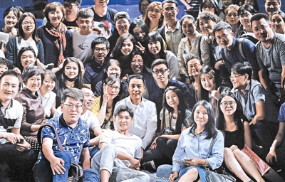 更让人暖心的是,为了让每个观众都可看到他,冯远征两个多小时的讲座始终站着。为他准备的桌子、椅子和茶杯成了安静的道具,且细心地考虑到三面座位的观众,冯远征会不时转向各个方向,让身处剧场角落的观众也似乎感觉冯远征一直在看着他讲。结束时,冯远征更是恭敬地冲三面观众鞠躬致谢。而在已经进入人艺会议室准备回家时,听说剧场里的读者想与他合影,冯远征立刻跑出来,并且一下子坐到地上,邀请大家,“来吧!”于是讲座时有些拘谨的读者,立刻疯狂起来,冲到冯远征身边,与这位表演大家幸福留影。