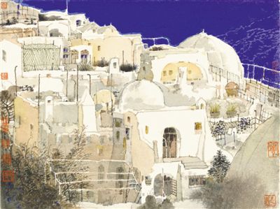 无疑,丝路沿线尤其是异国他乡不同的人文风物,对于创作者而言,是一种新鲜的视觉刺激,容易激发艺术灵感,也在观看方式、取景角度、传统笔墨程式、章法布局等方面,对创作者提出了挑战。面对以山水为主体的第一自然,以城市为主体的第二自然,卢禹舜以匠心和慧眼观察体悟,宏观探道,微观写真,在心手相应的艺术创造中,依托中国山水画传统,在笔墨、章法、赋色等方面进行了重构——意象的叠加,改变了惯有的虚实处理方式,天空或远山对色彩的运用,让画面更具现代感;焦点透视的运用,突出了建筑等人文景观,强化了画面布局的实景视觉体验;水彩色的介入,改变了色墨的比重和艺术的气息,让画面或更加清灵、透明,或更加静谧、深邃……对当代人感性经验和视觉感受的表达,让卢禹舜突破了以往的装饰画风和程式化的技法表现,既实现了艺术情感的深度表达,也让崇尚自然的精神境界更为广博多元。他在写生中强化了艺术的重构能力,也完成着对传统、写生和自身经验的多重超越。