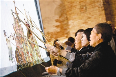第57届威尼斯国际艺术双年展中国馆,艺术家在表演皮影戏。 新华社记者 金 宇摄